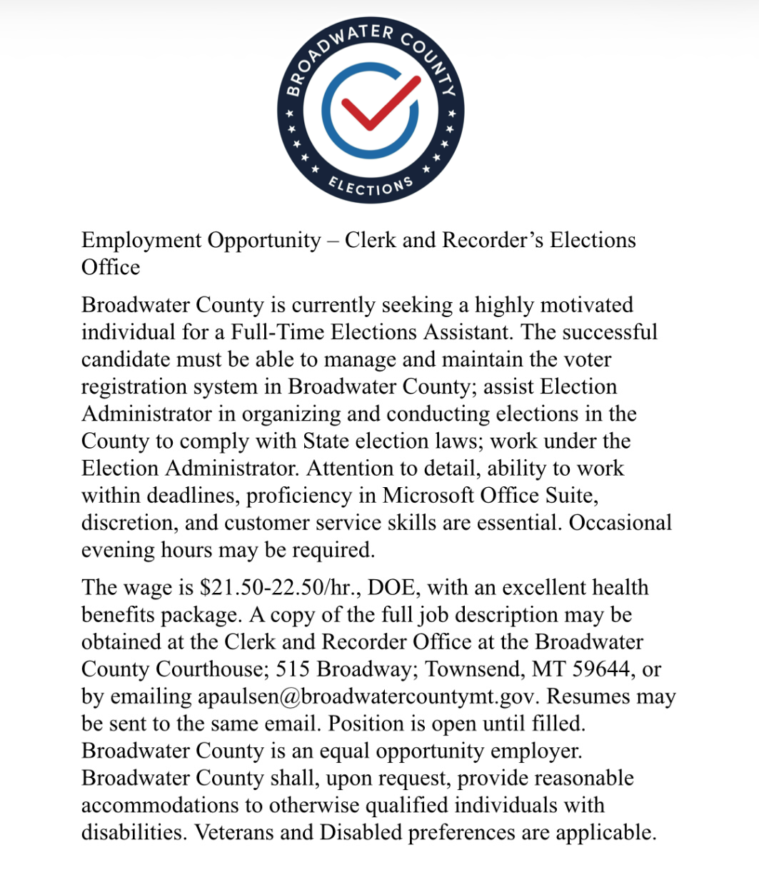 Broadwater County is currently seeking a highly motivated individual for a Full‐Time Elections Assistant.